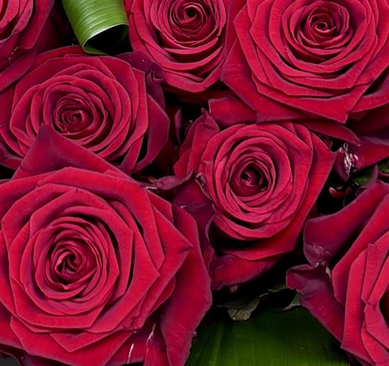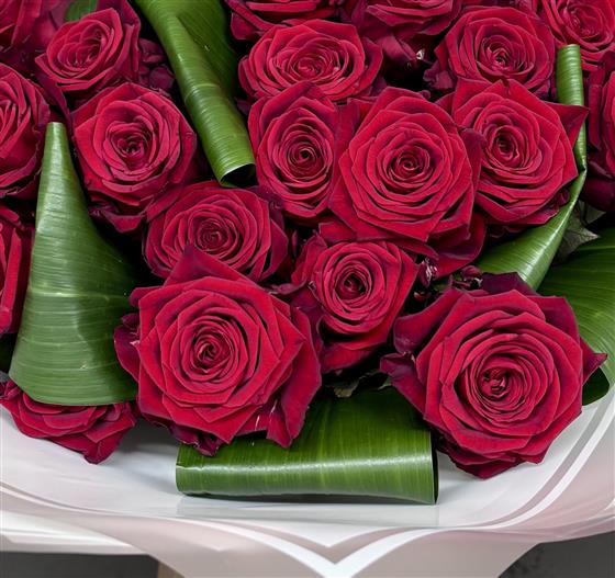Fifty stunning long stemmed red roses with aspidistra leaves expertly hand tied in water presented in a box.