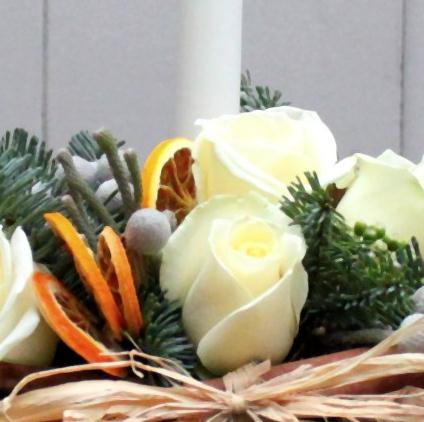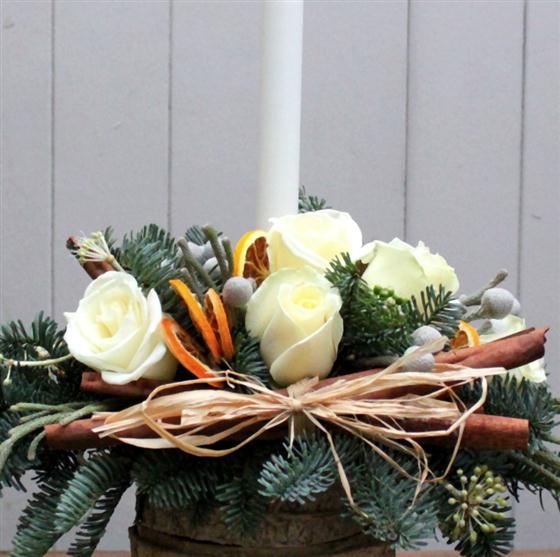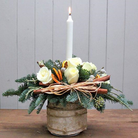 Christmas container (may vary to image), scented spruce, cinnamon, white roses combine to make this beautiful Christmas table centre.